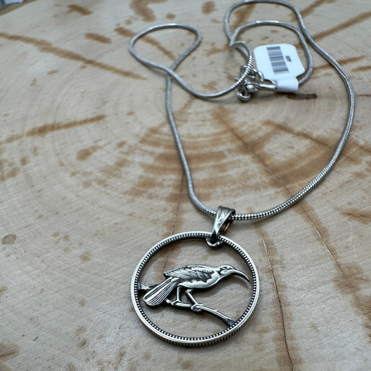 New Zealand Huia Bird 6 Pence Silver Hand Cut Coin Necklace