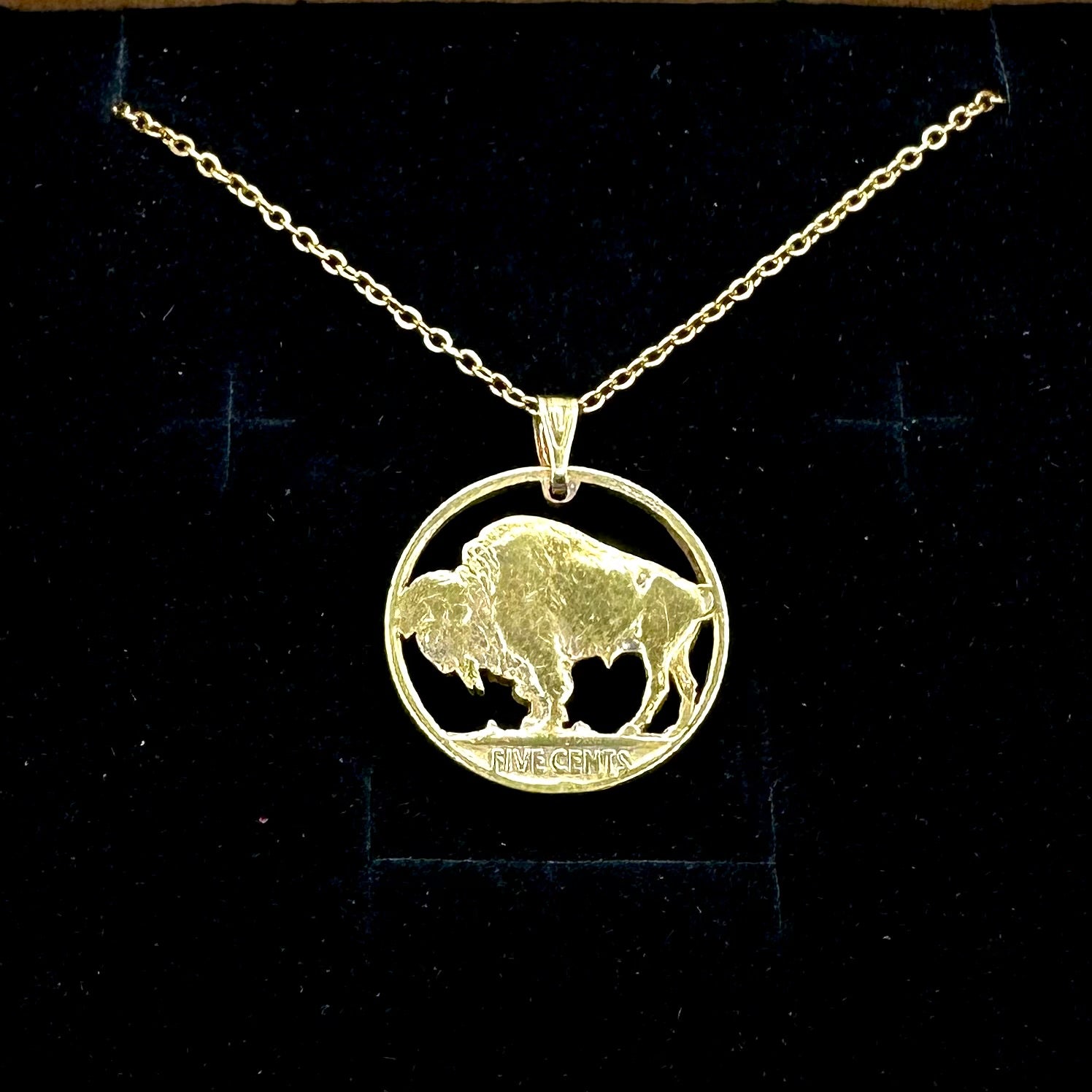 This U.S. Buffalo Nickel Hand Cut Coin Necklace (Back) depicts the great American bison. Each nickel has been cut by hand revealing its iconic design. This pendant is made with an authentic U.S. Nickel (1913-1938) in very-good condition or higher.
